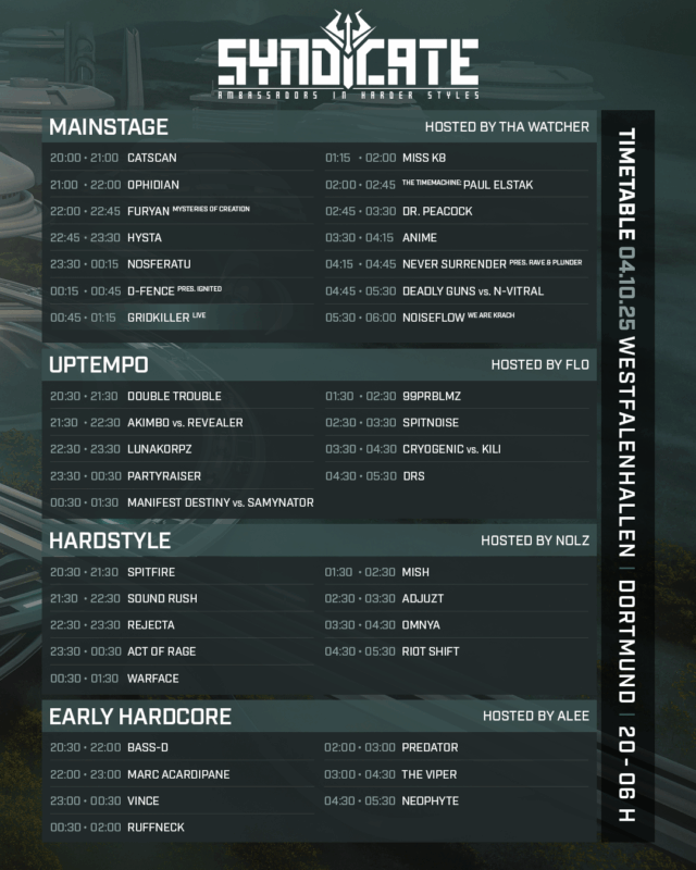 Das ist der SYNDICATE 2025 Timetable! Lade die App herunter und erstelle deinen persönlichen Timetable.